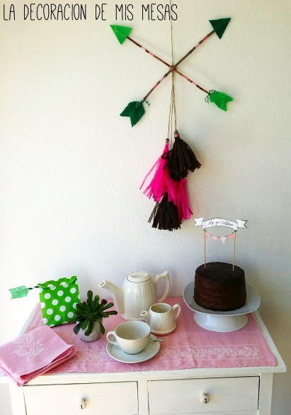 Las flechas se hacen con unas ramas, un poco de washi tape para adornar y fieltro para la punta y la pluma, nada complicado que haya que hacer un tutorial (pero sí lo queréis, decídmelo y lo subo próximamente). Unas borlas de papel y ¡andando que es gerundio!.